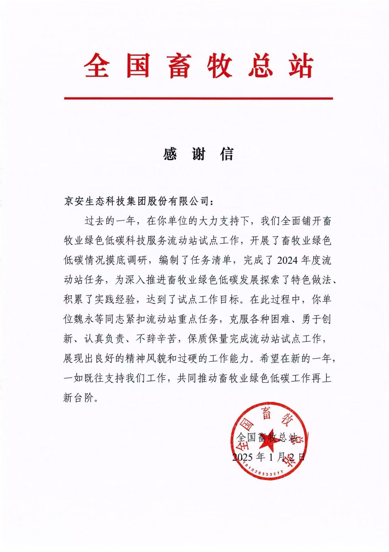 2025-01-22 10:40:30近日,全国畜牧总站向我公司发来感谢信,对京安生态集团畜牧业绿色低碳科技服务流动站试点工作表示充分的肯定与感谢。
